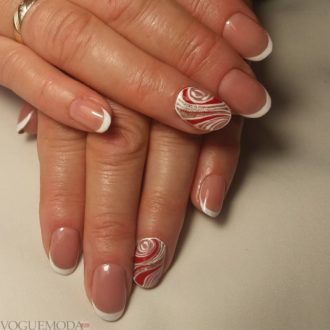 Часто встречается, красиво выполненный, френч на контрасте. Например, где улыбка выделена черным или красным. Однако, многие женщины предпочитают традиционный классический френч, но одну или несколько ногтевых пластин отводят под оформление, где создаются необычные надписи или рисунки.