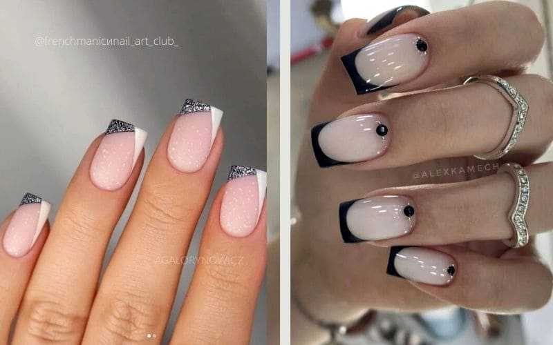 Скучные нюдовые тона френча умело разбавляются не только добавлением контрастных цветов, но и добавлением блестков серебра или золота. Небольшие детали дизайна, как рисунки и стразы привносят нежные нотки в такой, казалось бы строгий маникюр как френч. Главное — соблюсти меру.