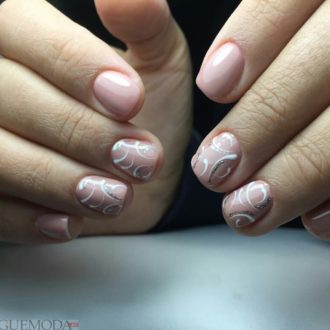 Не стоит забывать и о росписи на ноготках с естественным оттенком, которая станет «изюминкой» маникюра. Изображение мелких роз в бледных оттенках на двух ноготках в окружении светло-розового цвета будет смотреться очень женственно и изящно. Также можно использовать два лака одного тона, один из которых будет фактурный — для изображения узоров, второй глянцевый — для основы. Немного удлинить ногти поможет техника омбре с переходом одного естественного цвета к другому.