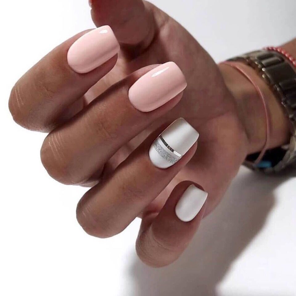 - Пастельное покрытие и негатив-спейс со слайдерами или арт-дизайном на нескольких ногтях – это еще вариант нестандартного подхода к созданию нежного маникюра.