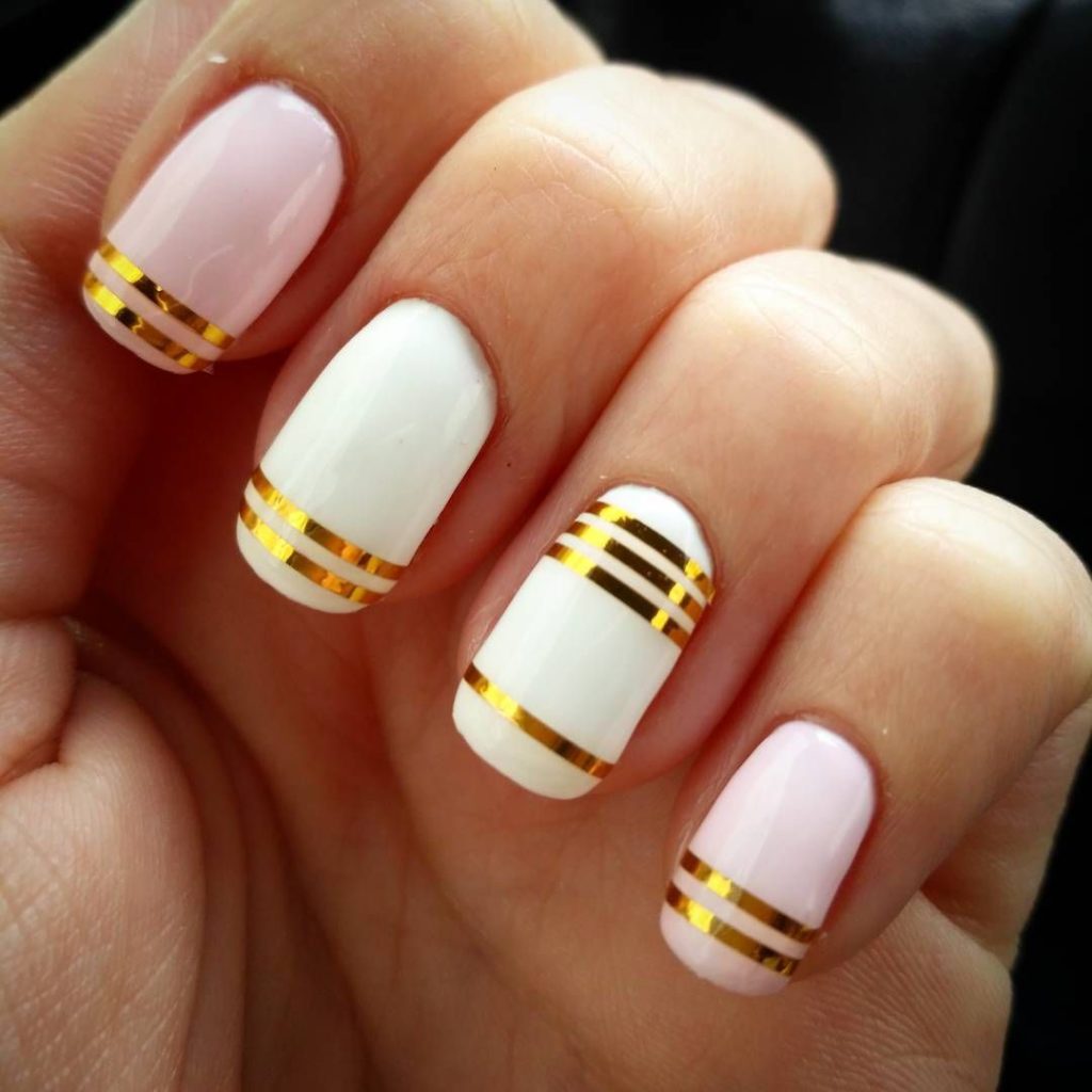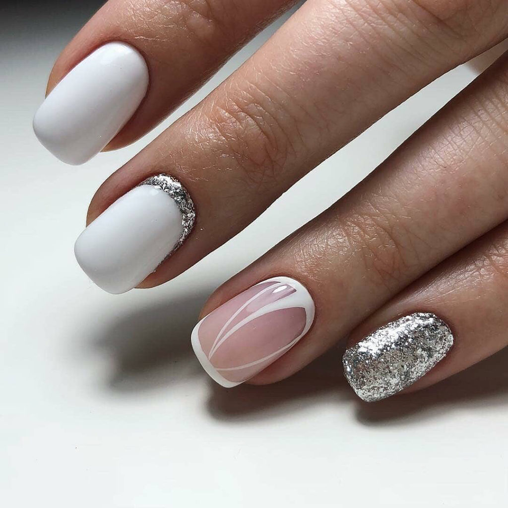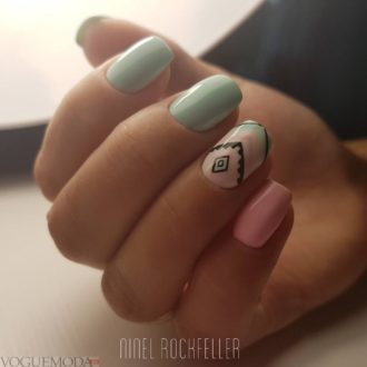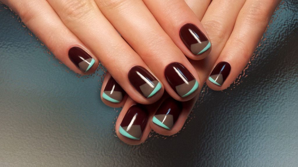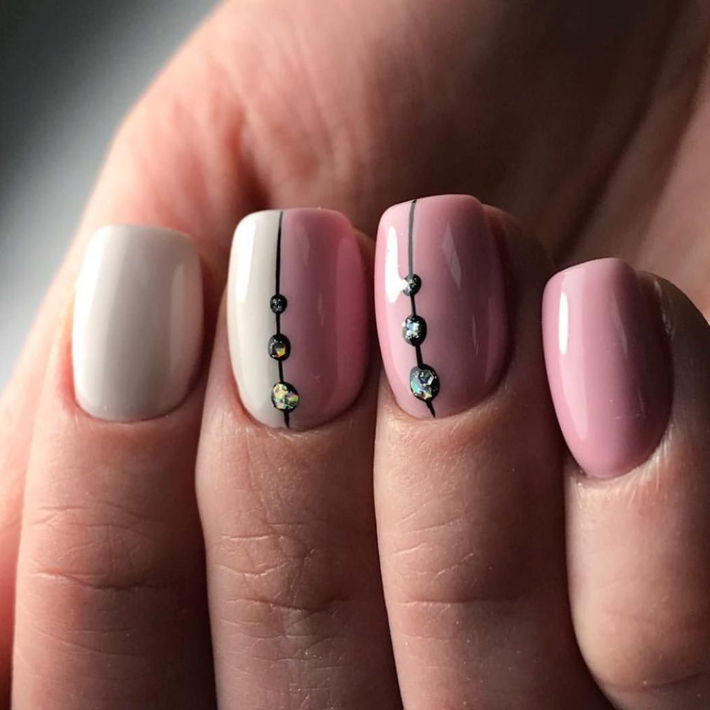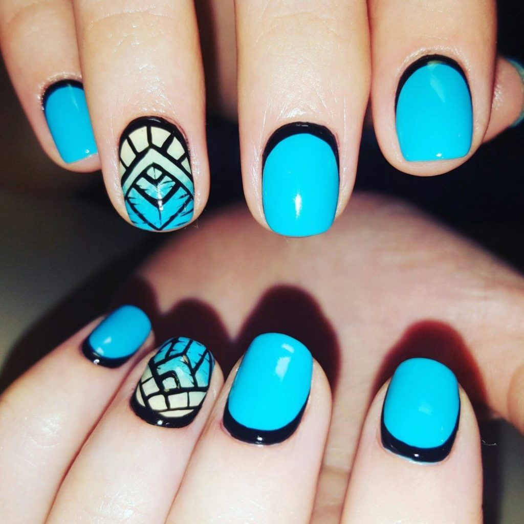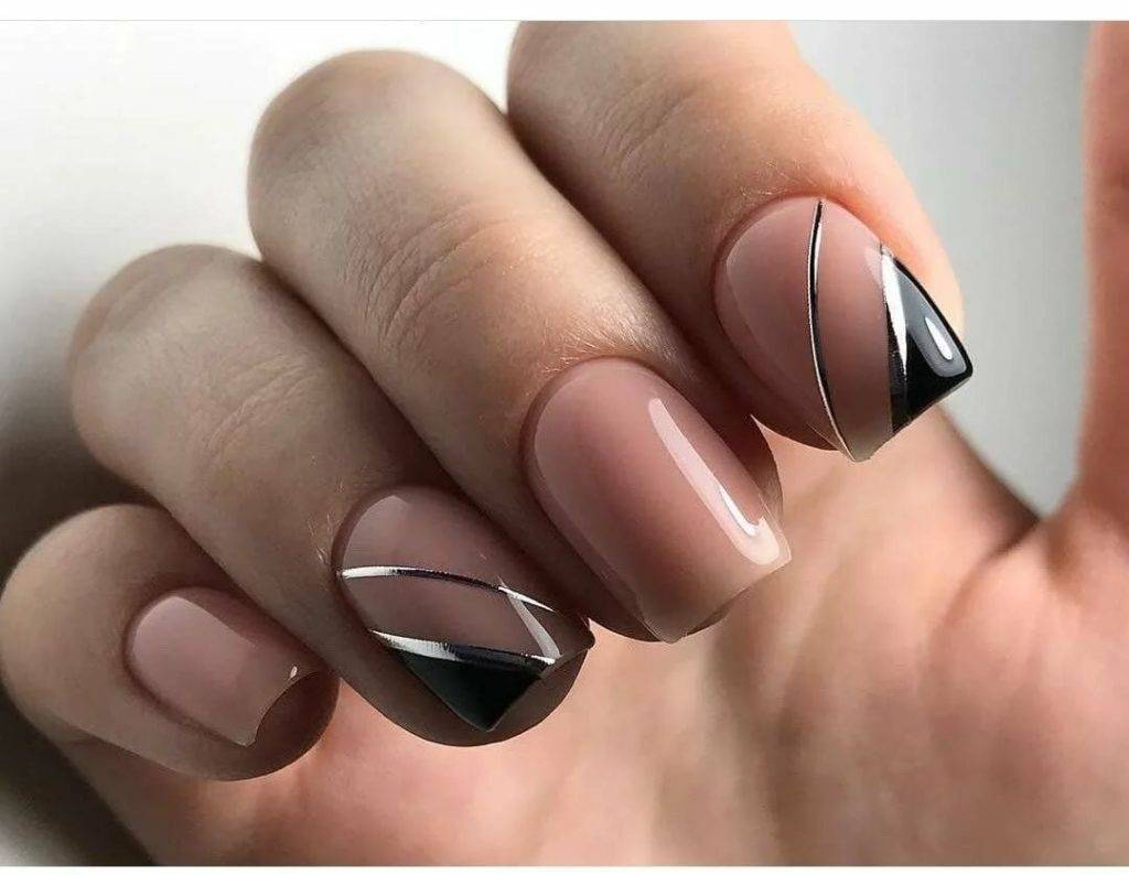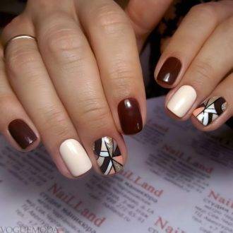 - Если выбрать геометрический дизайн, а фигуры и рисунки выполнить нейтральным цветом или блестками, то дизайн станет личным, совершенно новым нейл-артом.