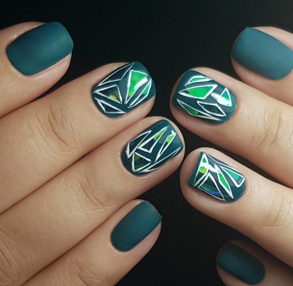 Также на ногтях могут быть изображены искаженные геометрические фигуры или разноцветные линии, беспорядочно «разбросанные» по ногтевой поверхности с использованием матового лака и глиттера.