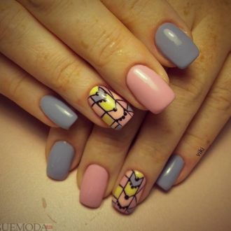 На коротких ногтях прекрасно смотрятся логотипы или надписи, что, в этом году считается популярным трендом. Что не скажешь про рисунок в виде мелкой сетки, которые лучше не использовать, или заменить сетку на более крупную. Еще одной модной тенденцией для коротких ногтей в этом году является обводной маникюр, когда ярким цветом выделяются края ногтя.