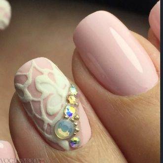 Маникюр на свадьбу принято выполнять на короткие ногти в тон цвета платья невесты. Почти всегда он в светлых тонах и с добавлением блесток, перламутра, втирки, светоотражающих элементов, которые придают дополнительное сияние. Светлые, пастельные тона – основа свадебного образа. Добавление страз придаст дополнительный свет и роскошь.
