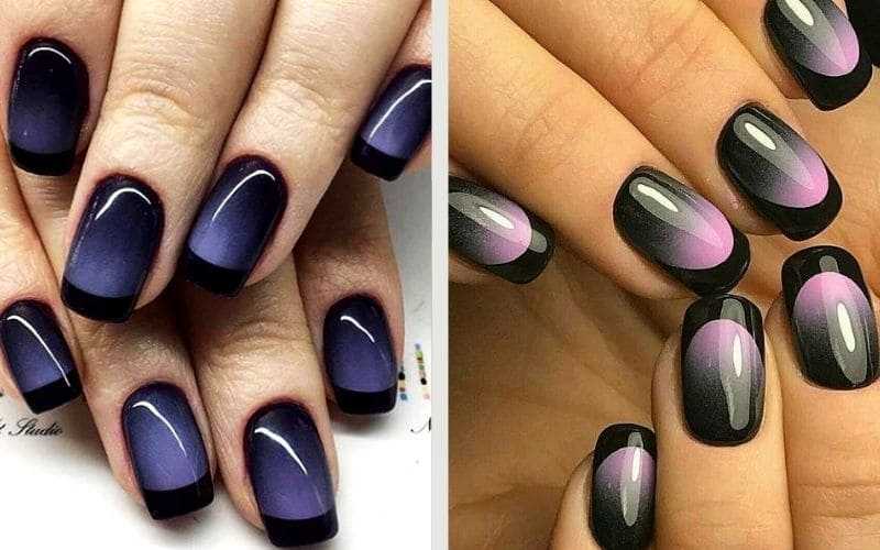 Интересно и стильно смотрится френч в темном цвете, выполненный в стиле омбре, когда зона улыбки выделена черным цветом. Довольно редкое и необычное сочетание техник.