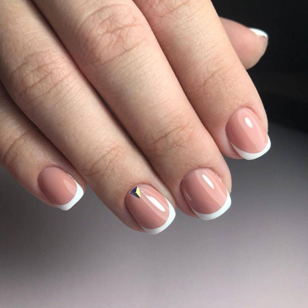 Маникюр на короткие ногти будет красивым, если нанести на ногтевую пластину прозрачную базу, а свободные края посыпать блёстками. Хрустальные бусинки в небольшом количестве остаются классикой жанра.