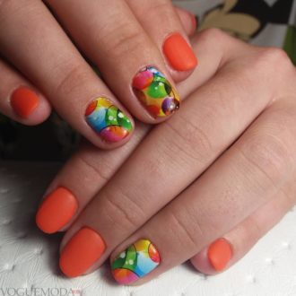 Немалый интерес проявили дизайнеры маникюра к художеству авангардистов, чьи хаотические кляксы и ляпы нашли свое применение на коротких ногтях. Интересно смотрятся яркие и контрастные оттенки без особого смысла рядом друг с другом, но особенно выделяются неординарностью на общем фоне кляксы в стиле психологического теста для преступников.