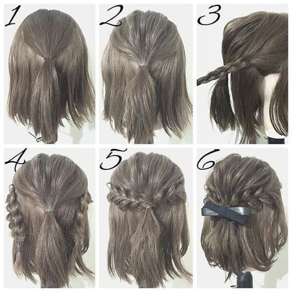 Сделать оригинальную простую прическу своими руками сейчас не представляет никакого труда. Обилие средств для стайлинга, различных аксессуаров и заколок для волос позволяет нам творить что угодно на своей голове и создавать за 5 минут прически хоть на каждый день, хоть вечерние. Длина волос тоже особой роли не играет. Хотите заплести косу на короткие волосы. Пожалуйста! Используйте маленькие силиконовые резиночки, которые надежно зафиксируют пряди и они не разлетятся в течение дня. Принцип плетения смотрите на фото ниже.
