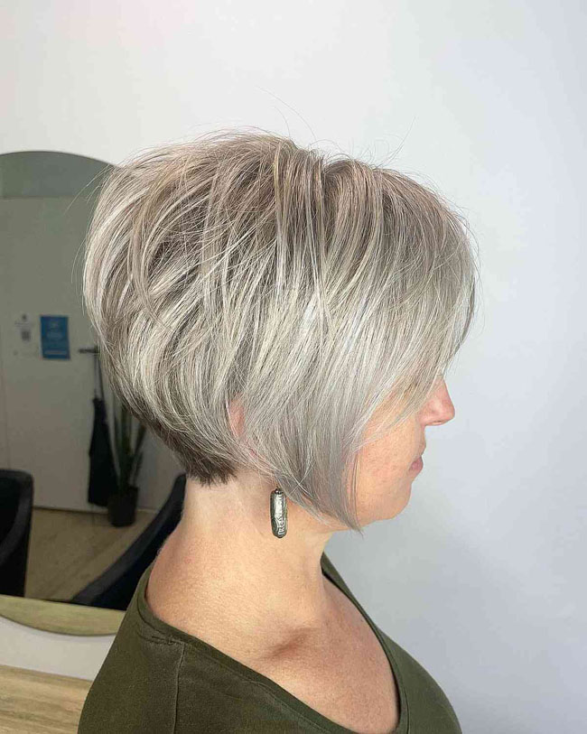 Эта прическа выглядит достаточно стильно и интересно, и она отлично подходит тем, кому за 50. В затылочной части волосы удлинены, макушка короткая. Лучше всего выбирать женщинам среднего телосложения или худым. Также рекомендуют выбирать тем, у кого прямые волосы.