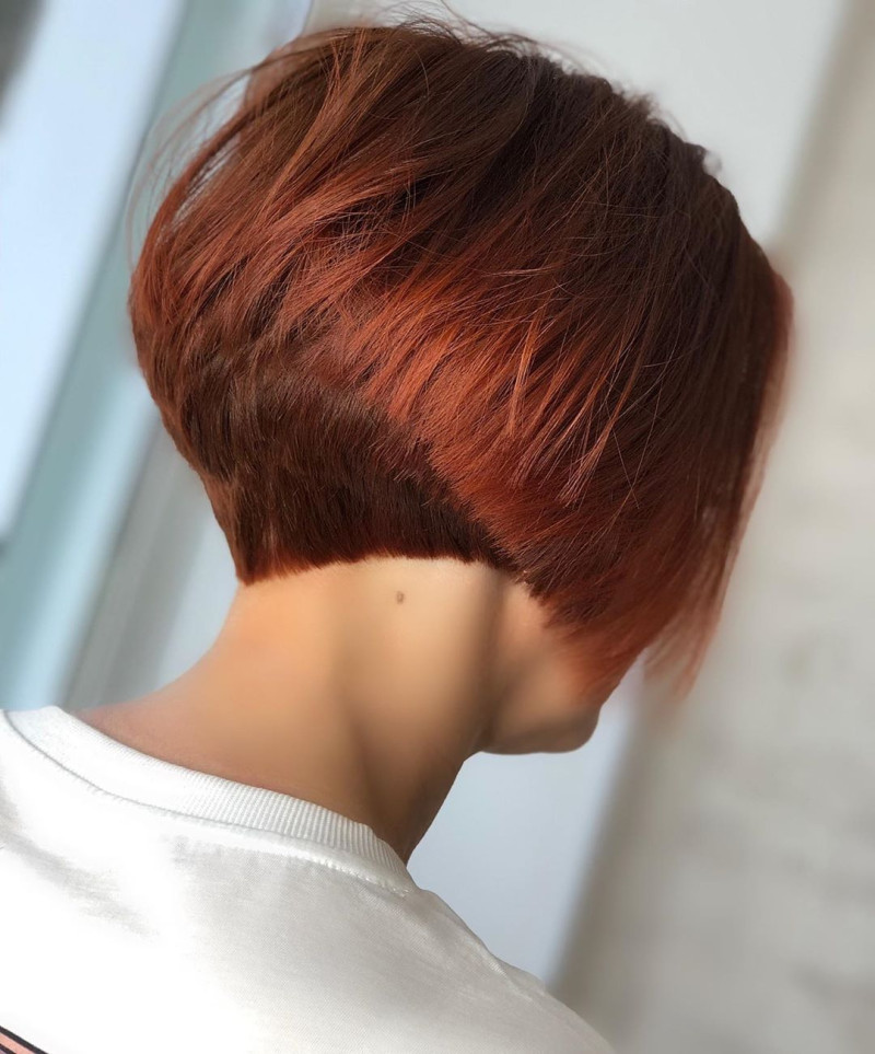Стильный вариант, который выбирают активные женщины. В области висков и на макушке длину убирают, с середины затылка волосы становится больше, они постепенно удлиняются. Но только в области шеи. На затылку густоту убирают