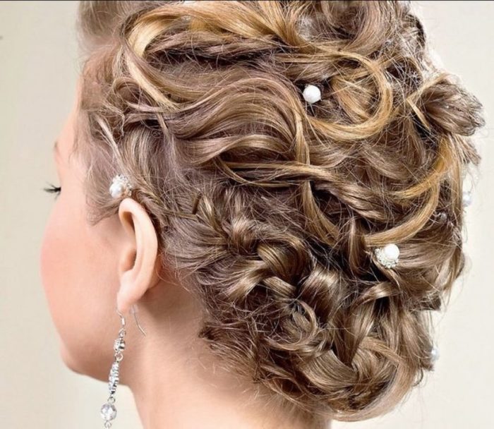 Не менее интересным вариантом будет «творческий беспорядок». Такая вечерняя прическа идеальна для коротких волос. Для ее укладки потребуется лишь расческа, мусс и лак для волос. После высыхания прядей следует сбрызнуть их стайлингом. Украсить прическу можно обручем с цветами или драгоценными камнями.