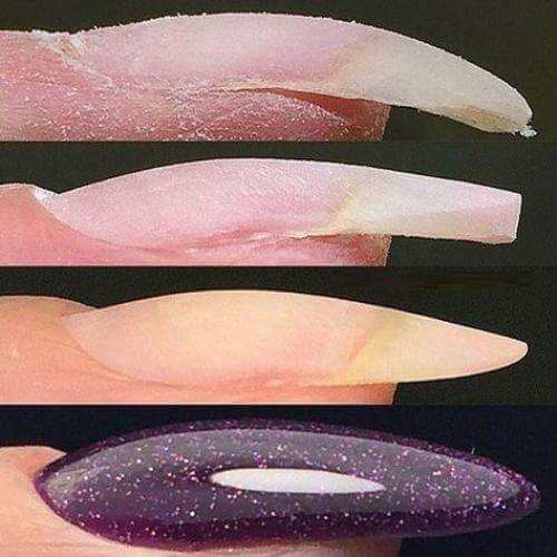 После того, как типсы приклеены, их следует укоротить до желаемой длины и немного опилить. После этого убирается пыль с поверхности ноготка при помощи растворителя, и ноготь перекрывается моделирующим материалом. Грунтовка не должна попадать на подложку, так как пластмасса может от этого пожелтеть. Коррекция на типсах с моделирующим акриловым материалом не требует тщательной подготовки поверхности подложки, а вот перед гелем или стекловолокном подложку следует обработать баффом. Прочность наращенным ноготкам придает моделирующий материал – акрил или гель. Поэтому, даже если со временем их базовая поверхность значительно сократиться, долговечность и прочность смоделированных ноготков никак не пострадает.