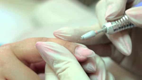 Обработайте ручки обеззараживающим средством. Возьмите фрезер и аккуратно плавными движениями удалите старое покрытие керамической фрезой. Следите за тем, чтобы насадка не травмировала натуральную поверхность ногтя. Не должно быть ощущение жжения или нагрева.