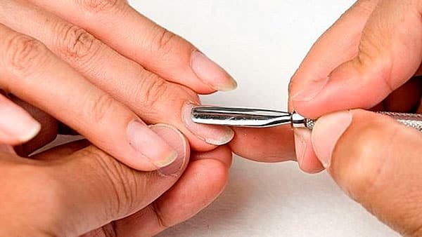 - Толщину натурального ногтя следует немного уменьшить посредством маникюрной палочки, а уже затем устранить и кутикулу.