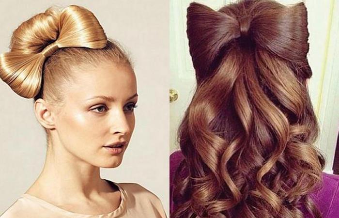 Прическа может состоять из крупного банта на фоне длинных волос, каре или другой стрижки, дополнять пучок, локоны или косы. Укладку допустимо дополнить маленьким аккуратным бантиком или целой линией однотипных элементов. Все зависит от повода, внешних данных, фантазии мастера.