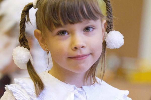 Самым простым вариантом такой прически является конский хвост, если девочка – обладательница длинных волос. Просто соберите волосы на макушке, зафиксируйте резинкой. Сверху наденьте бант, туго обвязав его вокруг. Если этот вариант кажется слишком банальным, вы можете, собрав волосы, выделить одну прядь, обернуть которую необходимо будет вокруг резинки. Конечный результат зафиксируйте шпильками, прикрепите к основанию получившегося хвостика маленький плоский бант. Получится простая, но в то же время элегантная прическа. То же самое можно проделать с двумя хвостиками.