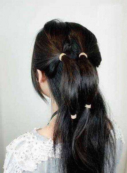 Потом проверните волосы вокруг резинки, вновь приподнимите остаток волос, скрутите их жгутом и просуньте за резинку. Кончики закрепите шпилькой.