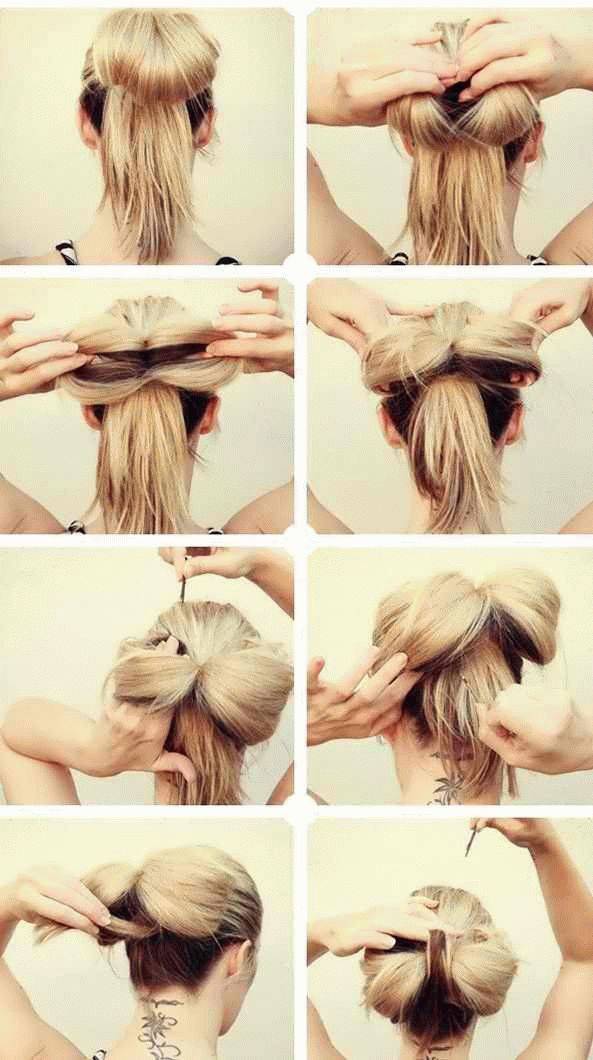 Для красоты можно завязать несколько ленточек разных цветов. Одной из таких неординарных причесок считается бант из волос, который можно легко сделать своими руками, потратив немного своего драгоценного времени. К тому же, эта прическа очень хорошо держится на волосах и не требует постоянной коррекции. 1. После того, как вы вымоете голову, нанесите на волосы специальный разглаживающий бальзам. Нижнюю часть соберите на затылке и завяжите резинкой, желательно имеющей цвет в тон вашим волосам.