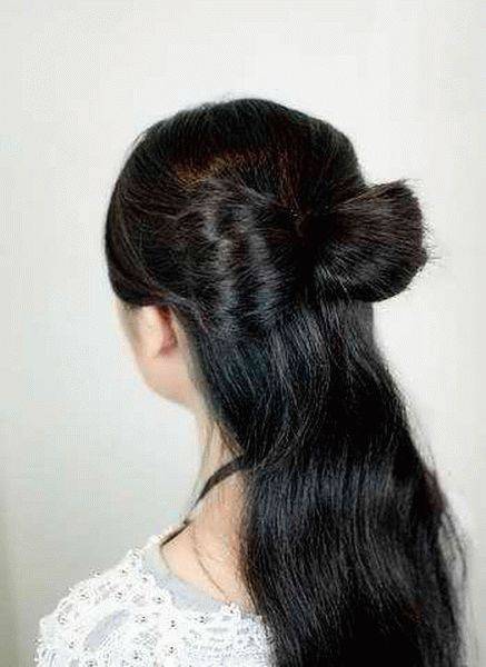 Часть волос на затылке нужно немного начесать, сбрызнуть лаком и разделить на две части. Каждую из частей присоедините к половинкам банта, придав ему немного пышности. Обе половинки банта скрепляются с помощью шпилек. 5. Переднюю часть волос немного начешите, пригладьте щеткой и обрызгайте лаком. Широкую прядь отведите назад, прикрывая таким образом середину банта. Концы заверните внутрь и закрепите невидимками.