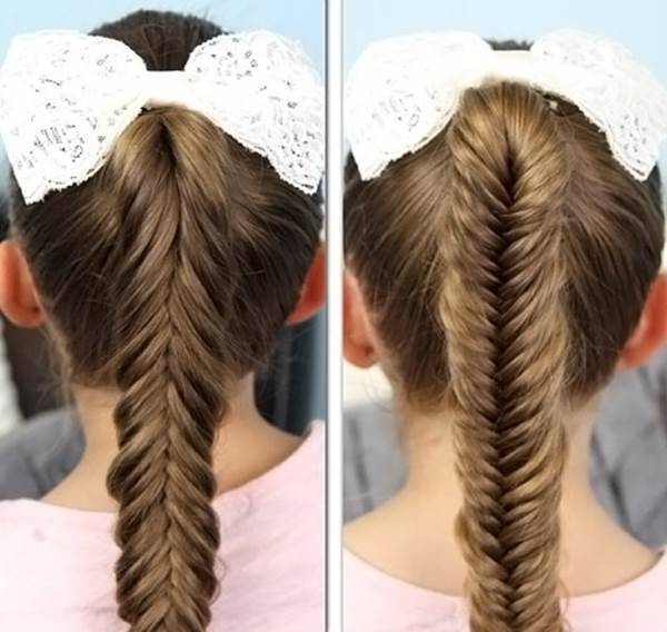 Наверное, самая распространенная прическа с бантами на 1 сентября – стандартная коса с бантом у её окончания. Впрочем, такую прическу можно дополнять разными идеями: менять количество кос или способ их плетения. Например, на пике популярности так называемый «рыбий хвост».