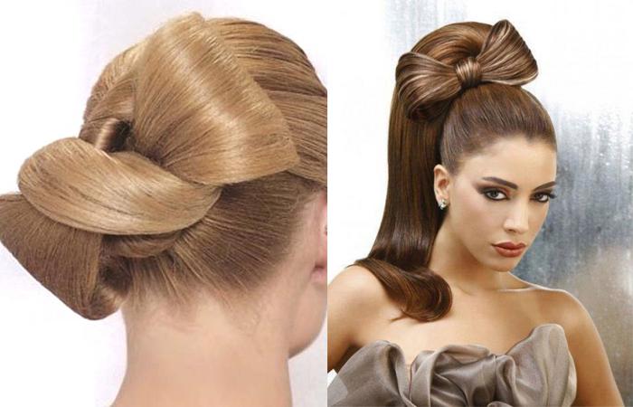 Есть несколько вариантов бантов. Каждый вариант отличается техникой исполнения и результатом. Они подходят для волос разной длины, фактуры, густоты. Можно все локоны собрать в бант или же оставить некоторые. Укладка может быть симметричной или асимметричной. Лучше всего бант подходит к длинным волосам, что позволяет выполнять объемные прически.