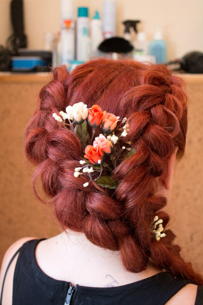 - Из плетения образуют розу. Для этого волосы обернуты по принципу «улитка», фиксируя цветок шпильками;