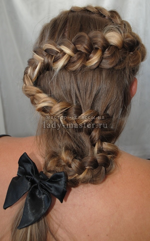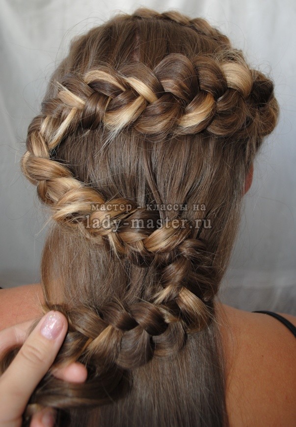 Как только плетение дойдет до уха с той же стороны, надо плести, немного не прибавляя прядки (до центра затылочной части).