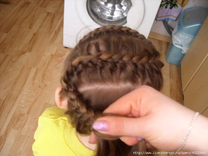 - Заплетают с височной области до уха на противоположной стороне. Выделяется прядка, разделяется еще на три.