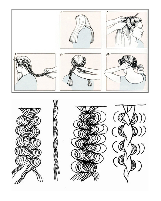 - тесьма узлов: две нити связаны друг с другом серией узлов; при этом можно заплетать обе части волос (один-два узелка используются как своеобразное украшение) и весь их объем;