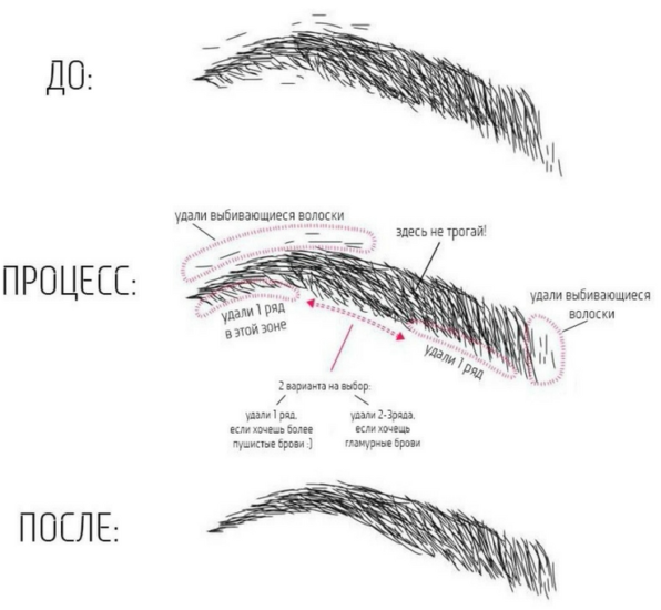 Когда все точки для идеальных бровей определены, следует избавиться от всех лишних волосков. При этом выщипывать ненужное лучше по нижней линии, не затрагивая верхнюю. Только после этого можно приступать к нанесению косметических средств.