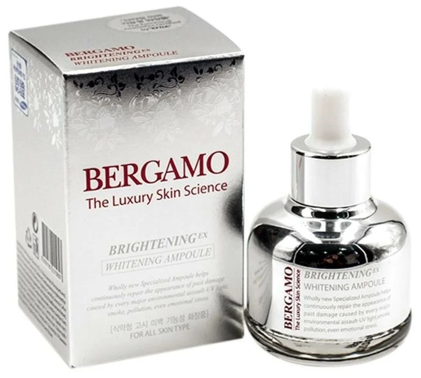 Bergamo Brightening EX Whitening Ampoule предотвращает образование и активацию меланина для максимального эффекта отбеливания и осветления. Проникает глубоко в кожу, обеспечивая мягкую текстуру кожи и увлажнение. Отбеливающие компоненты эффективно воздействуют на устойчивые пятна и веснушки. Основной компонент сыворотки ниацинамид. Это активный компонент для мощного клеточного обновления кожи, улучшает эластичность кожи и барьерную функцию. Осветляет, удаляет возрастные пятна и выравнивает текстуру и рельеф кожи.