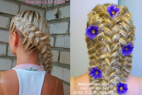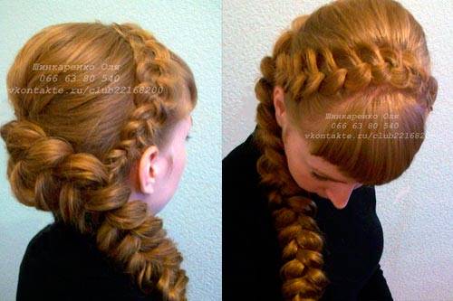 Ажурная коса набок, плетенная из 3-х прядей от линии лба со стороны одного виска по косой линии теменной части к противоположному плечу.