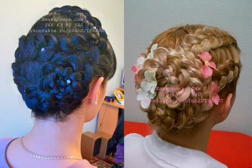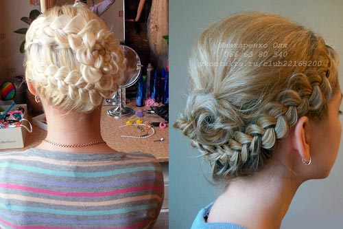 - Корзинка. Такая укладка действительно напоминать корзинку. Заплетают как обычно, но по кругу. Немного вытягивают для объема.