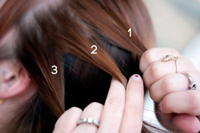 5. Теперь слева отделяем от основной массы волос небольшую прядку и соединяем ее с прядью №2, которая сейчас находится слева.