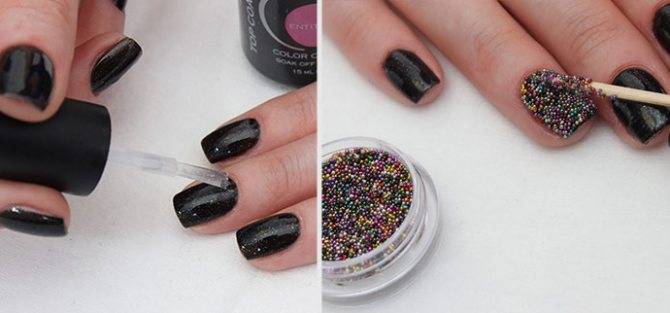 ВАЖНО! Если вы используете при декоре клей, то нанесите его на ногти тогда, когда убедитесь в полном высыхании цветного лака, причем только там, где будет располагаться ваш декоративный элемент. После этого присыпьте бульонки и немного придавите их к ногтю. Никакого закрепляющего покрытия в этом случае не нужно