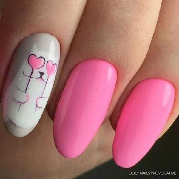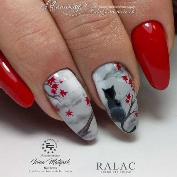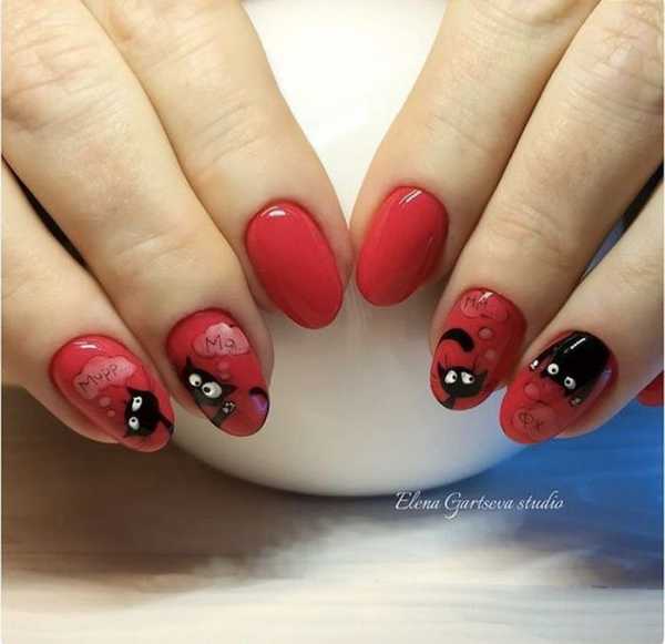 Очень интересно выглядит изображение кота и кошки в обнимку, нанесенных на фон в виде красного сердца или просто в сочетании с френчем. Подобная романтическая сцена подойдет, например, для Дня всех влюбленных.