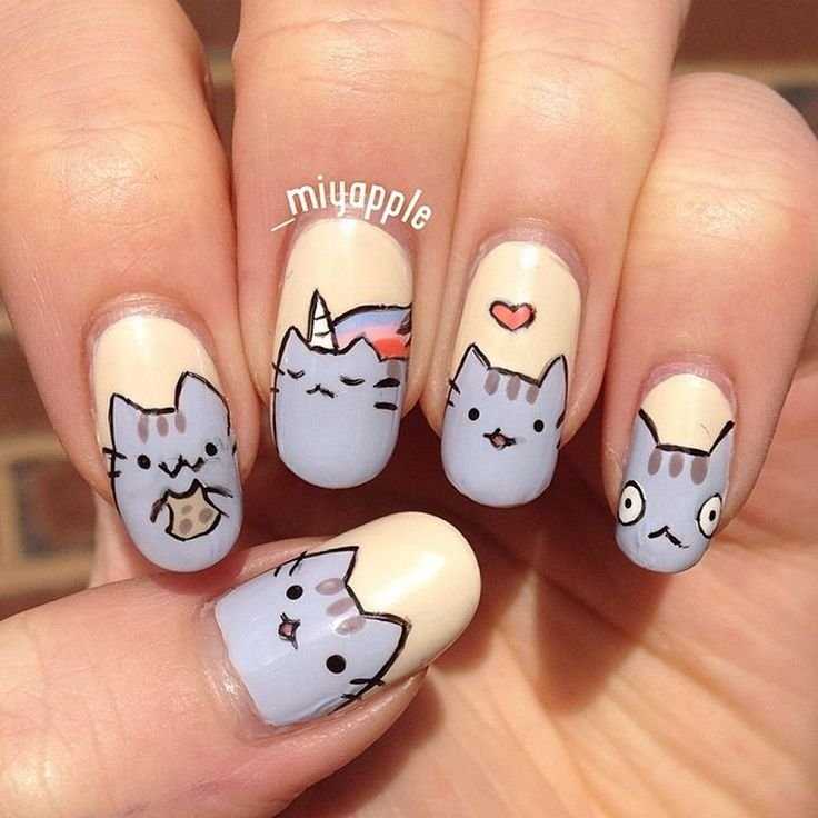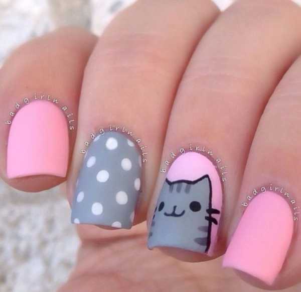 Тематика кошек на ногтях может быть выполнена различными оттенками лака, в забавном мультипликационном исполнении: