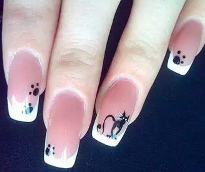 Маникюр с силуэтом кошки. А вот в таком маникюре Вы должны проявить максимум фантазии. Нарисуйте на одном ногте сидячую кошку, на втором прыгающую кошку, на третьем кошку, скрученную с клубочек и так далее.