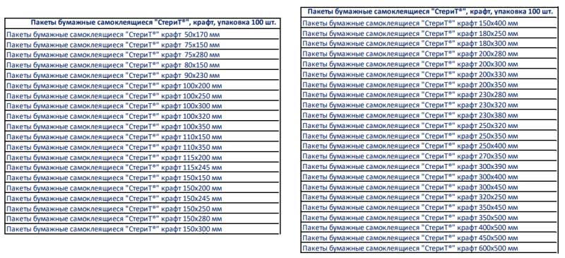 Размеры, как и у всех производителей, разные – от 75*150 мм. и выше. Цена – от 250 руб. за упаковку. Есть и обычные, коричневые крафт-пакеты, универсальные для всех видов стерилизации. Цена – от 200 руб.