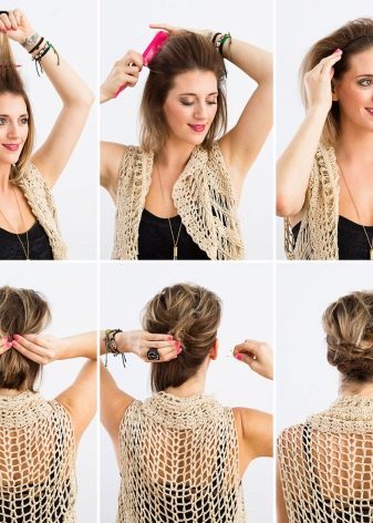 Волосы на макушке необходимо освободить от зажима и делать начес. Зачесанную макушку слегка пригладить расческой, зафиксировать лаком сильной фиксации. Концы прядок необходимо закрутить и заколоть в пучок чуть выше заплетенных кос.