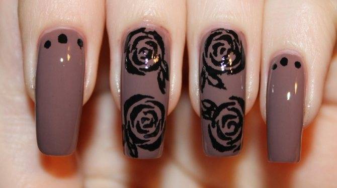 Нейл-арт с изображением черных роз будет выглядеть стильно, игриво. Такой маникюр практичный, прекрасно впишется в ваш повседневный образ в то же время может подойти на различные торжества.
