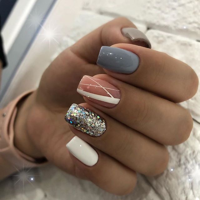 Для ежедневного образа подойдут пастельные оттенки. При необходимости другим цветом можно выделить ноготь на одном из пальцев одной или обеих рук. Классический вариант — черно-белый маникюр с блестками. Акцентный ноготь на руке можно декорировать блестками.