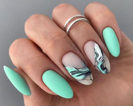 Очень популярный сегодня мраморный маникюр также выполняется в данной технике. Можно оформить круги с полутенью, паутинкой, опутывающей ногти, или создать эффект ракушки, а также использовать морскую тематику. Всё это доступно с применением данной технологии.