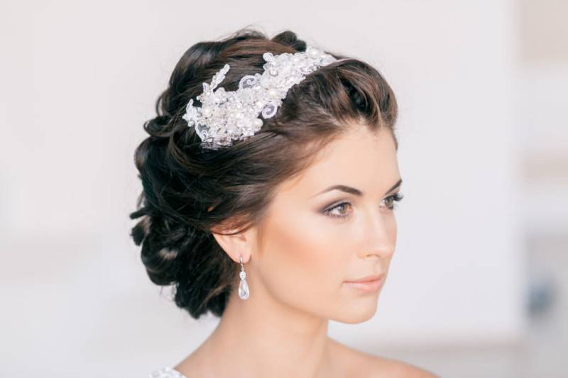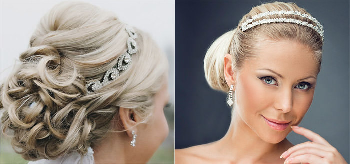 Праздничную укладку можно украсить обручем, ободком или повязкой. Аксессуары декорируют блёстками, искусственным жемчугом, бисером, перьями, живыми цветами – выбор зависит от образа и стилистики торжества: