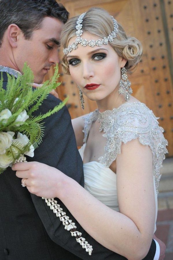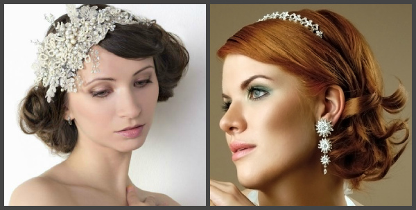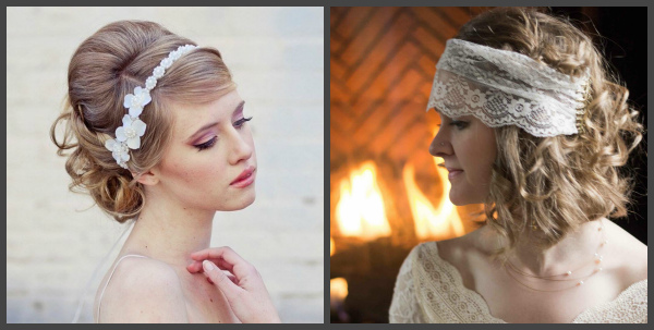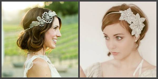 В зависимости от фасона наряда невесты повязка на голову также может быть в этническом стиле. Для стиля начала прошлого века ободок можно сочетать с ободком, украшенным стразами, бусинами и жемчугом.