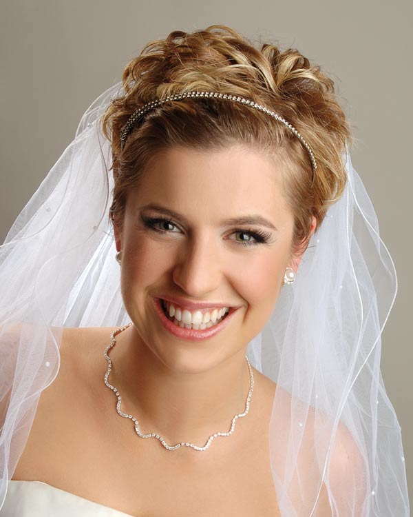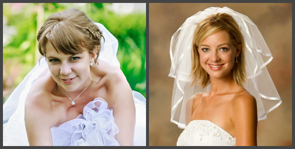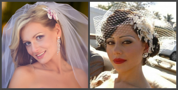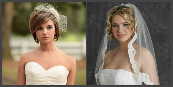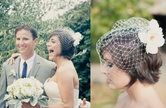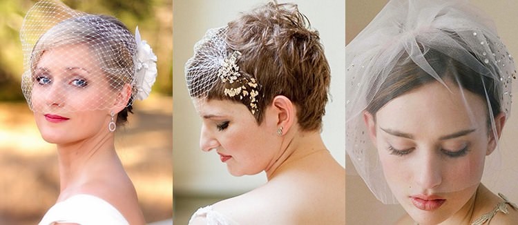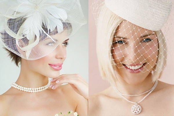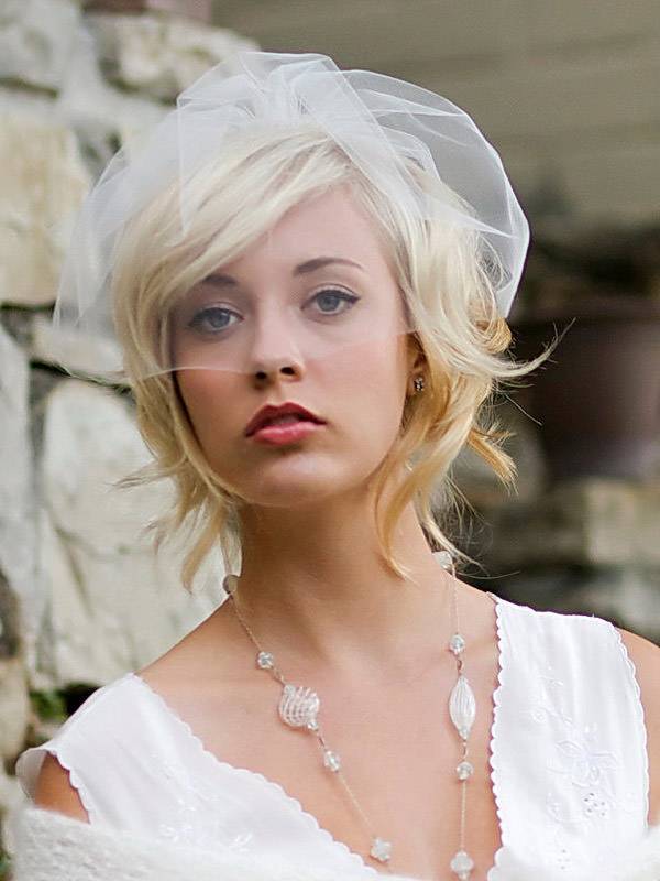 Для коротких волос подходит как укороченная фата, так и длинная — ажурная или простая и лаконичная