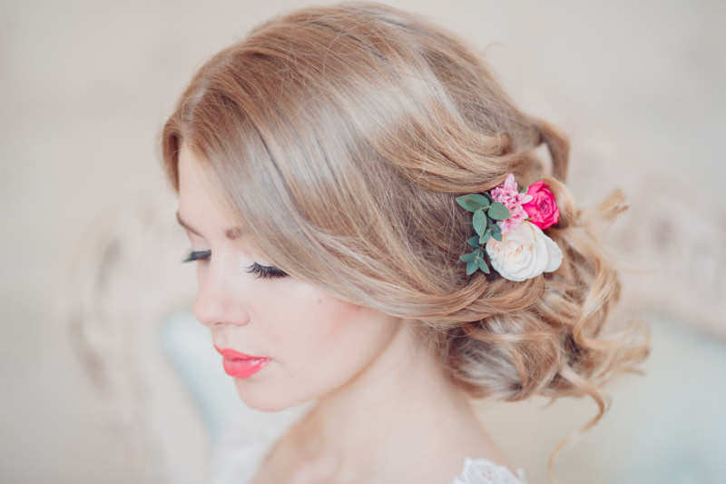 Цветы в прическе невесты всегда выглядят нежно и изысканно. Главное условие, они должны гармонично смотреться со свадебным нарядом и общим образом невесты. Для прически используют живые и искусственные цветы. Их делают из натурального шелка с таким мастерством, что с трудом можно отличить от настоящих. Отлично сочетаются цветы с прической в греческом стиле. Фата, украшенная ободком из цветов, выглядит особенно нежно и невинно.