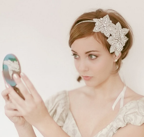 Ажурная, винтажная повязка, украшенная перьями или нежными цветами идеальное дополнение к свадебному образу невесты с очень короткими волосами.