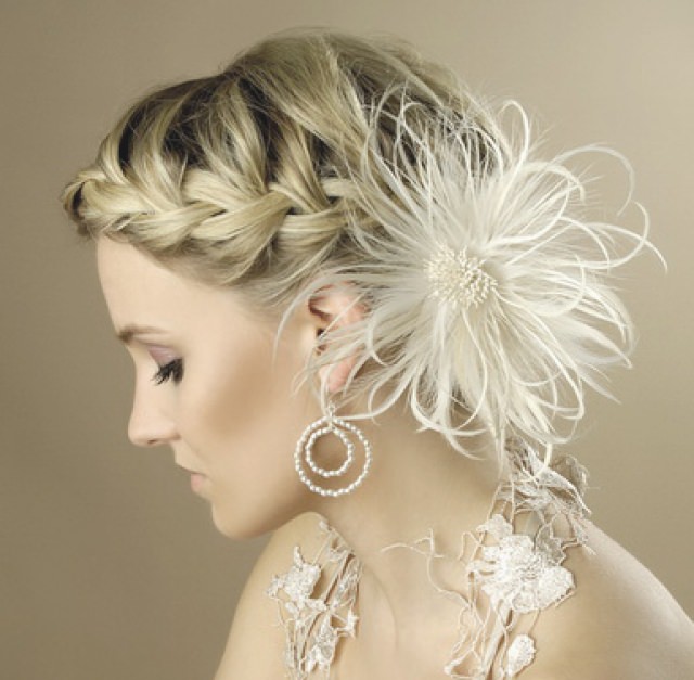 Перья в этой прическе должны быть очень легкими и нежными. Они могут не только дополнить цветок, но и сами составить композицию. Бусины таких же оттенков, бусины и стразы хорошо сочетаются с цветами и перьями.