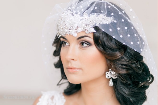 Для свадьбы в ретростиле можно заменить фату на короткую вуаль из органзы или кружева. Вуаль сделает образ оригинальным. Волосам придают форму легких кудрей, зачесывают назад и слегка приподнимают, если необходимо слегка вытянуть форму лица.